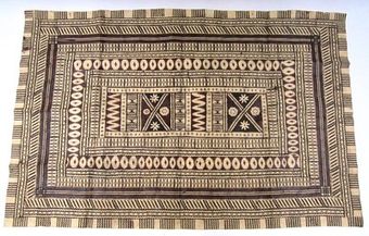 ["Grote tapa, over het gehele oppervlak versierd met zeer licht bruine motieven. Hieroverheen zijn met bruine verf donkerder figuren aangebracht, in diabolo-, driehoek- en ruitvorm."]