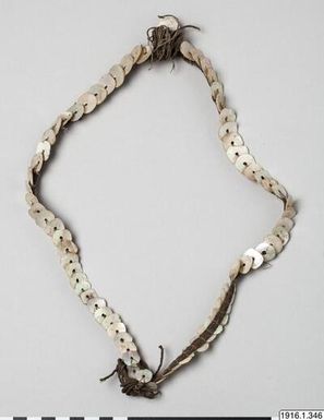 - Necklace consisting of round slices of shell, cut and ground and through a hole made up on twisted string of plant fibre.