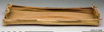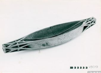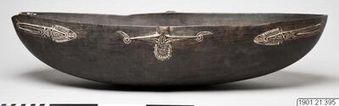 - Unselected wooden trough with two pointed, decorated handles. The outside is decorated with a geometric pattern cut out in wood.(mibo)