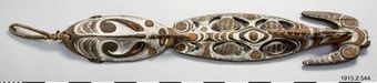 - “Temple ornamentation” aV type 546-47. Flat, narrowly uniform; originally seen painted red and white Oval’s head with long nose and small, high-seated eyes. % Body "with a hull of inset ° ornaments; the most important scars 3 crossed ovals, connected by on oblique continuous double lines. Back flat, without ornaments, apart from a cut down. Length: 139 cm. Width: 2l, 8cm. (between the tips of the crescent) See photo. German New Guinea. [ocr]