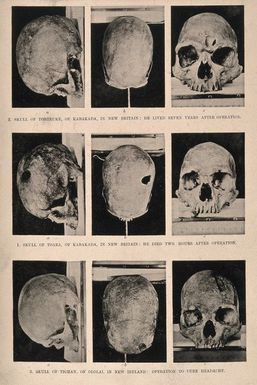 - Lettering: 2. Skull of Tororuke, of Kabakada, in New Britain: he lived seven years after the operation. 1. Skull of Toara, of Kabakada, in New Britain: he died two hour after the operation. 3. Skull of Tighan, of Ololai, in New Ireland: operation to cure headache.