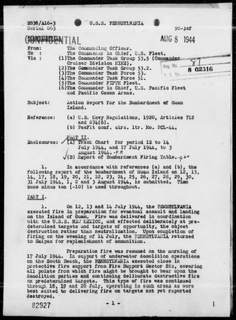 - The USS Pennsylvania, the third vessel to carry the name, is shown during a bombardment of Guam Island in 1944. The Pennsylvania was launched March 16, 1915, commissioned June 12, 1916 and decommissioned August 29, 1946. Credit: U.S. Navy