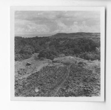 - Photograph taken from above showing Guadalcanal's hilly landscape covered in dirt paths and trees. In the foreground muddy vehicle track prints are visible on the ground. 1 photograph : b&w Solomon Islands - Guadalcanal Islandnorth=-9.443341; east=159.954709;