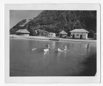 - Photograph of two men in small wooden canoes. They are shirtless and wearing shorts and paddling the canoes with paddles. There are support poles coming off the canoes. 1 photograph : b&w ; 4 x 5 in. New Caledonia