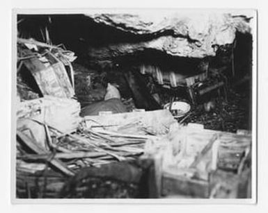 - Photograph taken inside a Japanese dugout, the space is cramped and dirty littered with palm fronds. On the left is a box with faint Japanese characters etched or drawn on it. On the right is some wooden crate or shelf with a dirty white bowl underneath it. The ceiling is exposed and uneven stone. 1 photograph : b&w ; 4 x 5 in. Solomon Islands - Guadalcanal Island