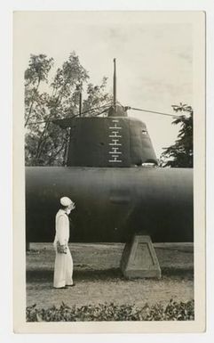 - Photograph of a sailor touching the side of a small Japanese submarine on display outside. The man is wearing the white sailor's uniform and hat. The sailor has his face turned away from the camera and only part of the submarine is in frame. 1 photograph : b&w ; 8 x 12 cm. United States - Hawaii - Honolulu County - Oahu Island