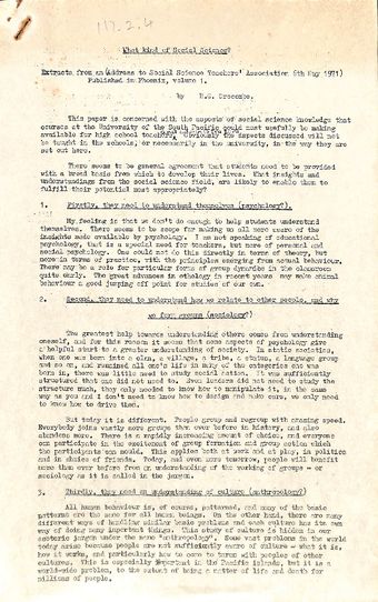 - Copy of article Pacific Societies Today and Tomorrow by Ron Crocombe, notes on draft of paper and related correspondence on the subject of social science in the Pacific [Former Institute of Pacific Studies file ref: IPS 10/24/2]