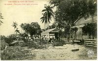 - Vue de Fare, probablement après le passage du cyclone du 7 février 1906. Au premier plan, un amas de tôles ondulées et de planches. Au second plan, une maison d’architecture moderne dont les fenêtres à guillotine ont résisté à l’ouragan. Trois hommes,en pantalon et camisole à longues manches, se tiennent debout sous l’avancée de toit soutenue par une colonnade. À l’arrière plan, on aperçoit d’a...