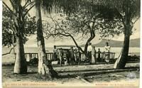 - Groupe d’enfants devant une maison de construction traditionnelle. Au premier plan, quatre fillettes en robe et un jeune garçon se tiennent par la main. Au second plan, le « fare » sur pilotis, au toit végétal en pandanus, dont on distingue une cloison faite probablement de cannes de bambou. À l’arrière plan à gauche, on aperçoit une montagne. Le mont Pahia (Pa'ihia) ? La végétation environnant...