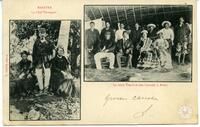 - Carte à deux vues. Sur l’image de gauche, le chef rebelle de Raiatea, Teraupoo, et sa famille. Il est vêtu d’une veste sombre et d’un pantalon blanc, et porte une casquette. Un uniforme militaire ? À califourchon sur sa jambe, un jeune garçon en costume. À sa gauche, vêtues de robes « mission », sa femme coiffée d’une couronne végétale, et debout derrière elle, une adolescente, fleur à l’oreill...