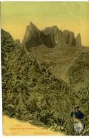 - Groupe de trois hommes posant aux abords d’un cours d’eau. Au premier plan, l’homme en appui sur un rocher et vêtu d’un paréo porte un fusil. Un chasseur ? Au second plan, les deux autres le surplombent, juchés sur un gros bloc de pierre. Ils transportent un régime de bananes plantains « fē’i » (Musa troglodytarum). Celui de droite porte un paréo et celui de gauche semble nu. En contrebas, on a...