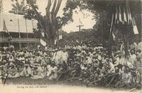 - Pirogues décorées pour les fêtes de juillet dans le port de Papeete. Au premier plan, à droite, une pirogue à balancier et, à gauche, une pirogue double, surmontées l’une et l’autre d’un dais décoré probablement de fleurs et de guirlandes végétales. Un homme, coiffé d’une couronne végétale, manœuvre une pagaie, assis à l’arrière du « va'a ». À l’arrière plan, on devine deux baleinières s’amarra...