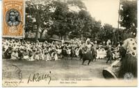 - Groupe d’hommes exécutant un « ‘ōte’a tāne » (danse traditionnelle masculine) sur une plage. Ils portent un « more » (jupe réalisée en « pūrau », Hibiscus tiliaceus) dont on distingue le tressage de la taille. À droite, un jeune garçon joue probablement d’un petit « tō’ere » (percussion faite d’un morceau de bois évidé présentant une fente dans sa longueur), et on aperçoit la main d’un second m...