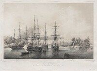 - Vue de l’avenue du Petit Thouars à Papeete. La rue est bordée d’arbres (tamariniers ou marumaru ?). À gauche, une barrière en fer forgé délimite le site où se trouvait autrefois le bâtiment des Contributions et Octroi, aujourd’hui le parc Bougainville. En débord de la clôture, on distingue une construction (?). À droite, la route longe un long bâtiment construit sur pilotis. Au second plan, la ...