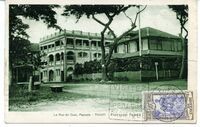 - Vue d'une rue de Papeete, bordée d'arbres (tamariniers ou marumaru). Au premier plan à droite, la charette d'un marchand ambulant et, plus loin, des maisons d'architecture moderne. Probablement des magasins. On aperçoit les colonnades des galeries inférieures et les balcons protégés par des balustrades. Fixées à l'une d'elles, des enseignes sur lesquelles on peut lire « Tony's ». Sur la route,...
