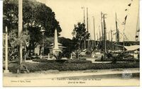 - Vue du quai du commerce, à Papeete. Au premier plan, on distingue un personnage coiffé d’un chapeau (?) assis dans une embarcation et des bateaux amarrés au quai. Les haubans des voiliers ont été décorés de fanions et de drapeaux. Au second plan, on aperçoit les poteaux des lignes électriques, et à gauche, le monument aux morts, situé place de la Mutualité, fait d’un obélisque surmonté d’un bou...