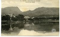 - Vue du « motu » Uta prise depuis le rivage de Tahiti. Au premier plan, le lagon. À l’arrière plan, le « motu » couvert de végétation notamment de cocotiers. À droite, on devine un ponton (?) et à gauche une construction du pilotis. Imprimé au recto, le nom du magasin de Georges Spitz à Papeete. Aucune date d'édition n'est mentionnée sur la carte postale. La datation approximative proposée résul...