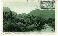- Vue de la cascade de la Fautaua, sur l'île de Tahiti. Au premier plan, on devine des fougères. La carte est colorisée. Aucune date d'édition n'est mentionnée sur la carte postale. La datation approximative proposée résulte d'une analyse des indices de mise en forme et de la correspondance.