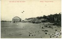 - Vue d'une maison d'architecture moderne construite en bord de mer. Au premier plan, sur la plage, des pirogues à balancier. Au second plan, des hommes sur le rivage, d'autres dans une pirogue sur le lagon. À l'arrière plan, on distingue la maison construite sur pilotis. On aperçoit les fenêtres protégées du soleil par un battant horizontal. À droite, on devine un ponton et, dans le lointain, de...