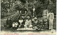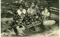- Carte à deux vues. Sur l’image de gauche, un portrait de trois jeunes gens. Les deux jeunes filles sont coiffées de couronnes de fleurs et vêtues de « robes mission » rehaussées de broderie anglaise et de dentelle. L’une est debout, l’autre assise. Au second plan, sur la gauche, un homme en paréo et camisole à longues manches. Les trois personnages tiennent un petit bouquet dans la main droite....