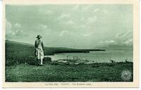 - Groupe de quatre femmes posant dans une rivière. Trois sont assises sur un rocher, la quatrième debout. Elle sont coiffées d’une sorte de bandeau et vêtues de paréos fleuris noués sur la poitrine. Autour de leur cou, des colliers de fleurs ou de coquillages. Deux d'entre elles, portent un bracelet. À l’arrière plan, on aperçoit les montagnes et, dans le lointain, le mont Te Tara o Maiao (ou Te ...