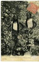 - Femmes allongées sur une natte. Elles sont vêtues d'un paréo fleuris qu'elles ont noué par dessus leur robe. Autout de leur cou, de longs colliers probablement fait de graines ou peut-être de perles et de coquillages. L'une d'elle est coiffée d'une couronne de tête faite des mêmes matériaux. Toutes deux portent une fleur à l'oreille et des boucles d'oreilles. À l'arrière plan, on devine une pal...