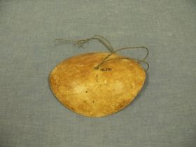 - Nagyjából háromszög alakú. Alapját sűrű vesszőfonat képezi, mely külső oldalán aszfaltszerű anyaggal van bevonva. Széleit szabadon hagyott teret nassa-kagylók sora, az ezek által szabadon hagyott helyet fekete és vörös magvak díszítik. Felső részén a vesszőfonat, középső részét és oldalágait két sorban elhelyezett, végeiken átfúrt külső oldalán...