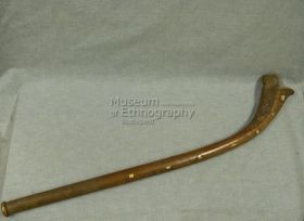 - Világosbarna keményfából készült, görbe vonalú. A markolati rész megközelítőleg hengeres, a vége ellapított. A keresztmetszet a másik végénél háromszög alakúvá válik, a három oldalú gúlára emlékeztető részen mindhárom oldal finoman faragott és vésett. PA súlya 0,262 kg.