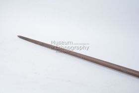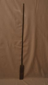 - Fából faragott, barnás színű tárgy, hengeres nyéllel, téglalap alakú lapátrésszel. A nyél végén stilizált madáralakkal.
