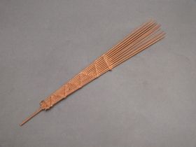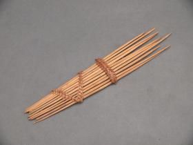 - Nyolc darab vékony, egyik végén hegyes, világos szintű fapálcikából álló téglalap alakú tárgy. A pálcikákat kereszt és átlósirányban húzódó világos rostfonadék fűzi össze.