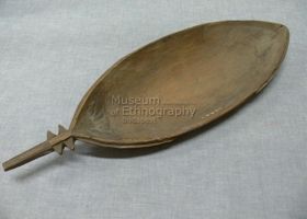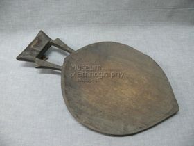 - Hosszúkás ovális alakú, csúcsban összefutó végű, egyik végén durván faragott kis, fogószerű résszel ellátott fatál. Szürkés-barnás színű. Díszítetlen, lapos.