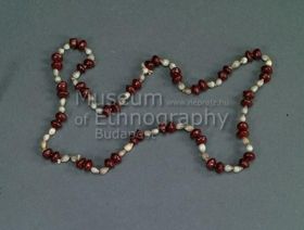 - Zsinórra fűzött, alsó végükön átlyukasztott kisebb-nagyobb fogakból és fehér-piros gyöngyökből álló dísz.