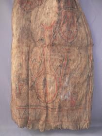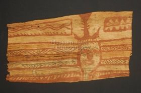 - Hosszúkás, világos színű, fekete és vörös geometrikus mintákkal díszített kéregtextil.