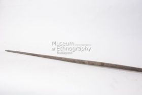 - Bambusz nyelű és hegyű nyílvessző. Szélesebb levél szerű hegyén fekete geometrikus motívumok díszítik. A két rész találkozásánál növényi fonat fogja össze.