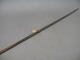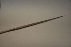 - Kétrészes nyílvessző. Nyele sárgás, hengeres nád, karcolt geometrikus mintákkal és vonalakkal. Hegye négyélű keményfa, egyik oldalán V alakú faragással díszítve. A két rész fonott háncsgyűrűvel összeillesztve.