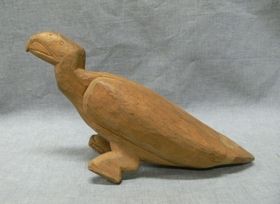 - Barnás vöröses színű, kemény faanyagból faragott férfialak. Jobb kezét magasba tartja, egykor valamit tartott benne. Bal kezét pajzzsal combjához szorítja. Az arc és a test meglehetősen naturális stílusban kidolgozott, a pajzs finoman vésett. feje hátoldalán is van szem kifaragva. A lábszár tégla alakú idomokban folytatódik. Dereka körül pálmale...