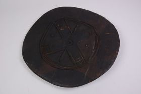 - Korong alakú, vastag, nehéz faanyagból faragott lap. Külső oldalán a peremmel egyezően vájat húzódik körbe, a körön belül X alakú, kiemelkedően faragott díszítés van. Az X szárai által határolt részek váltakozva vörös és zöldes színűek. A vájat és a pajzs széle között lévő sávon háromszöges, váltakozva vörösre és zöldre festett díszítés van. Bel...