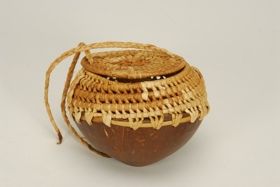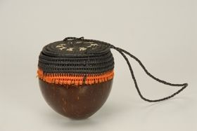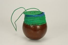 - Két darab világosbarna, kívül belül csiszolt negyed kókuszhéj, amelyről a kókuszdió eredeti magasságának kb. egynegyede le van vágva. A két rész adja az ovális táska két keskenyebb végét, amelyek oldala egy sorban ki van lyukasztva. Köztük növényi rostból sodort világosbarna szálakból készült 7 cm-es sáv található. Ezt növényi rosttal betekert f...
