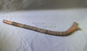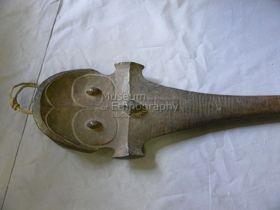 - Fekete keményfából készült. A nyél szabálytalan keresztmetszetű, hengeres. A markolat elvékonyodó, tompa hegyben végződik. A felső, ívelt vonalú 'lapát' mindkét oldalán, alul 'W' motívum, amelyből gerinc fut végig a 'lapát' belső ívéhez közelebb. PA Súlya 1,018 kg.