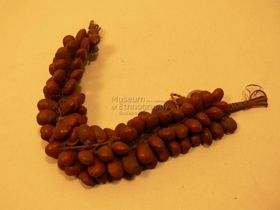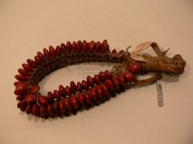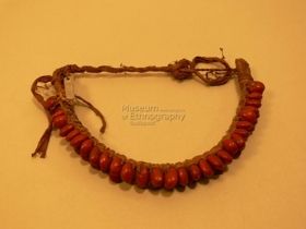 - Hat egymásmellé helyezett, rostfonallal egymáshoz kötött nádcsík. Két végén hurkot képező szalag egészíti ki. Külső oldalának felső peremére Nassa csigasor van varrva, alatta három sor kutyafog.