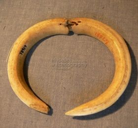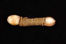 - Két, középen rostzsinórral összekötött, fehéres színű Conus-karikából álló disz. A Conuskarikák összekötött középső részére fehér, piros és zöld szinű gyöngyökből álló zsinórok vannak körültekerve, ezt egy hajlott, fehéres színű, középen átfúrt kagylóhéj ós a kagylóhéjról két-két gyöngysoron lelógó három kemény növenymagból és kettős kutyafogak...