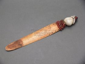 - Barnás színű, lopótök alakú, üres tökhéj, felső részén kerek nyilással. Hasi részén aszfaltszerű anyagba erősített kör alakú, kettős Nassa-csigahéjsorból, közepén nagyobb kagylóhéjból álló díszítés van, felső nyilasa körül hármas csigahéjsor foglal helyet. A hozzátartozó mésznyaló botocska hosszú, gömbölyű, körben rovátkolt.