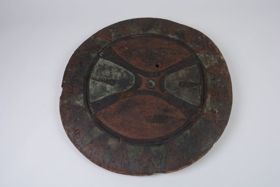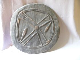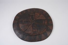 - Nehéz faanyagból faragott, feketés színű, kerek tárgy. Hátsó oldalán két nyílás van, az ezen keresztül húzott tapacsikkal erősítik fel a karra a pajzsot. Külső oldalán kör alakú peremmel bezárt felületen átlós alakú díszítés, a peremhez kapcsolódó részen ujjakkal.