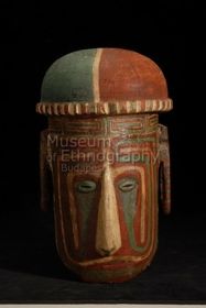 - Rotangnád-csíkokból készített, kúpalakú vázra felvarrt és festett faháncs lemezből készült. Elnyújtott emberi arcot ábrázol, az orra aránytalanul hosszú, benne keresztben álló orrdíszt jelző fapálcikával. Vicsorító fogait függőlegesen elhelyezett fapálcikák jelzik. Kinyújtott nyelve hegyes, háromszög alakú fahánccsal bevont váz. Teljes fejrésze ...