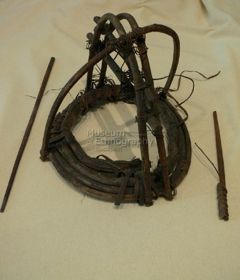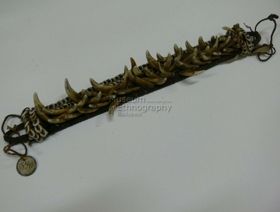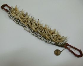 - Hat darab conus csiga karika egymás mellé kötve vörös növényi hánccsal. Egyik harmadában két kisebb karika van egymás mellé kötve. oabalan