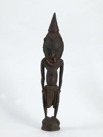 - Kemény faanyagból faragott, vöröses-sötétbarna színű, talapzaton álló férfialak. Lábai-karjai nyújtottak, a kezek a combhoz simulnak. A köldökön kör alakú vésés. A fej hosszúkás, az orr és a szemöldök kiugróan faragott. Az átfúrt orrba rostköteg van helyezve. A két lapockán szabálytalan koncentrikus körök.