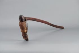- Fanyelű balta kőpengével. Nyele sötétbarna színű, hosszú, enyhén íves, hengeres keményfából faragott. A nyelet képező fa ága kb 80 fokot zár be, erre van rögzítve a penge foglalata, amihez az ág el van laposítva. A külön foglalat két faragott fa elemből áll, végén ellaposodó hengert képezve. Szélesebb végébe illeszkedik a sötét kőpenge. A foglal...