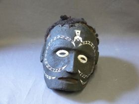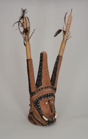 - Egyetlen darab puhafából faragott antropomorf arc ábrázolás. A szemnyílások oválisak, 1-1 zöldes kagylóból készített szemgolyóval. Az orr görbe, a száj félig nyitott, a fogak fekete-fehér jelzéssel. A szájban kis disznófej faragvány van. Az arc hátsó részéből hengeres faragvány fut az orrnyíláson át körbe, felfelé két oldalt egy-egy nyúlvánnyal....
