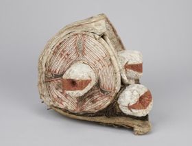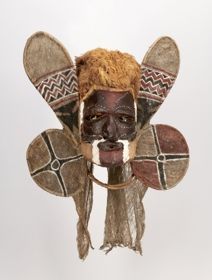 - A maszk arcrésze puhafaanyagból van faraga. Az arc nagy részének felülete sötétbarnára festett, álla oldalt világosbarnára hagyott. Homloka felső sávja kiemelkedően faragott, és apró, szúrós magok fedik, melyeket függőlegesen festett vörös és fehér sávok díszítenek. Orra, szája, szemöldöke és a szemnyílást takaró háromszög alakú fedőlapok felteh...