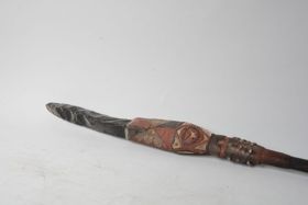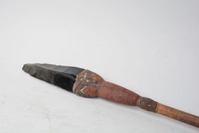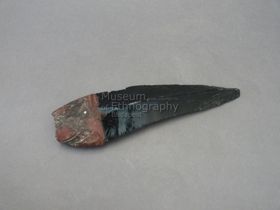 - Háromrészes tárgy. Nyele hengeres, sötétbarna színű keményfa. Ehhez négy sor gyönggyel díszített kötözéssel, szépen faragott, feketére és vörösre festett, fehérrel inkrusztált farészt erősítettek. A farész kiszélesedő részéhez kötözéssel és aszfalt szerű anyaggal erősítettek a lapos, fekete színű, enyhén hajlott, hegyes obszidián pengét. PA: Az...
